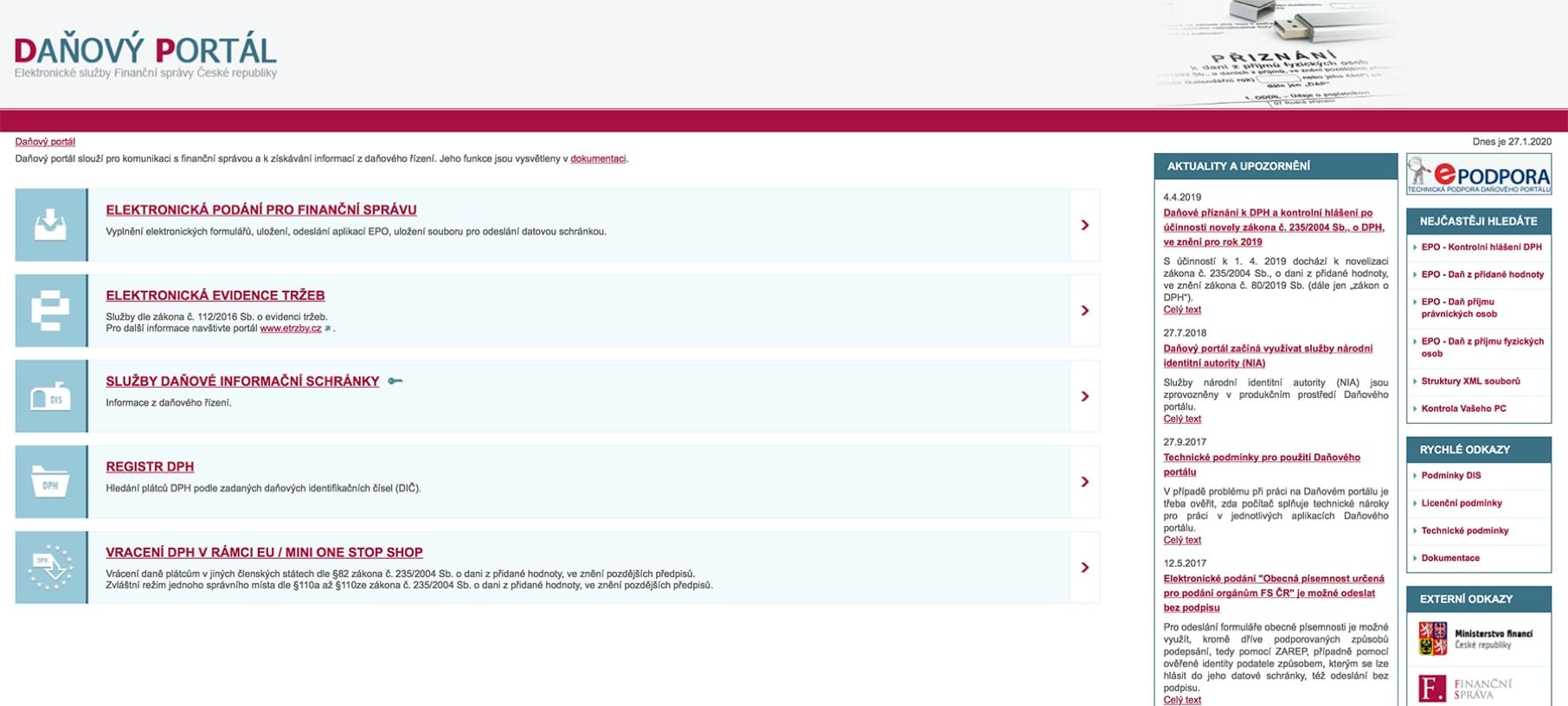 Daňový portál je web, provozovaný Ministerstvem financí ČR, který slouží k účelům EET. Je potřeba se na něj přihlásit pomocí tzv. “autentizačních údajů”, což je v podstatě uživatelské jméno a heslo, podobně jako znáte z přihlašování na e-mail nebo na sociální sítě. S tím rozdílem, že si je nevolíte sami, ale dostanete je od finančního úřadu.